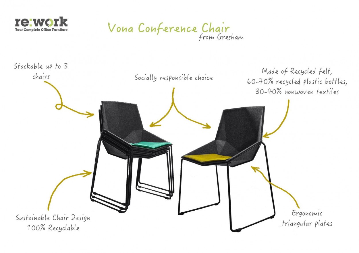 A great example of a recycled product is the Gresham Vona conference chair. It is made of recycled Felt. To be more exact 60% recycled PP bottles and 40% non-woven textile. This design idea is not only reducing waste but is actually “re-working” it, by making these purchasing decisions you can help with buying more ‘sustainably’.