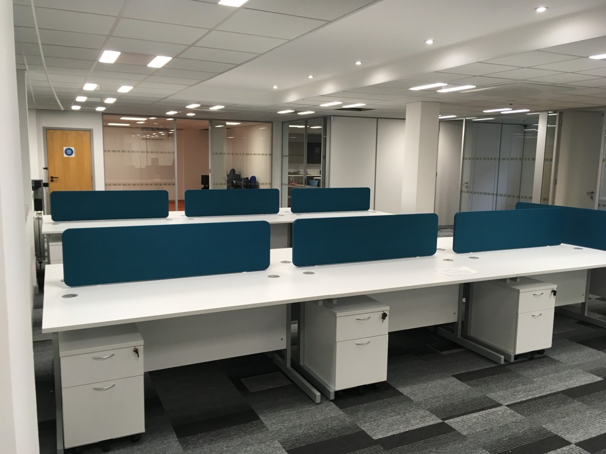 We worked closely with their facilities lead, Sarah, to create a colour scheme and theme that work with the brand and materials used on their refurbishment of the ground floor. After visits to our showroom to look through all the options for finishes and fabrics, we suggested radial and shorter desk screens to create a sense of space whilst ensuring each workstation had a dedicated area.