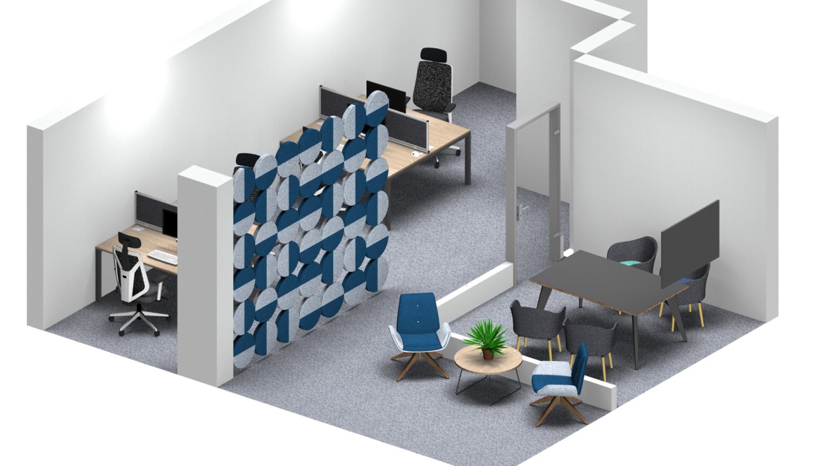 The furniture also had to mirror the company colours of various blues and greys. We also had to deal with the challenge of separating the open plan of the visitor area from the office area. We proposed two partition options: one made of acoustic panelling and another made of woodwork. Both options would be suitable for a statement logo display making a great first impression upon entering.
