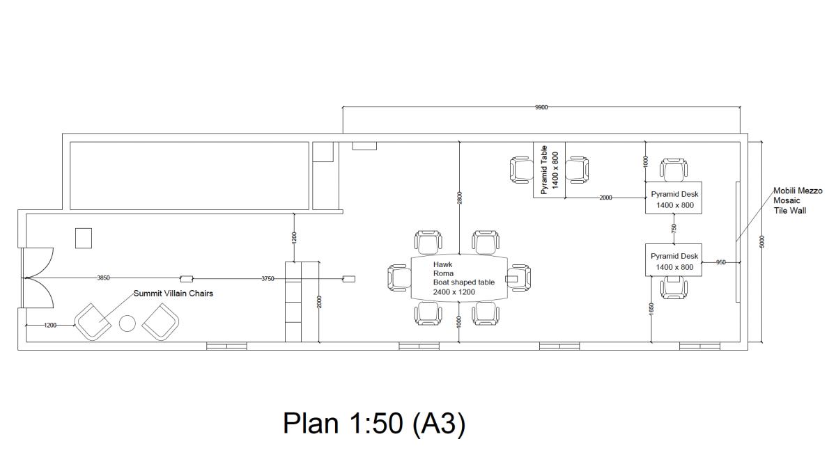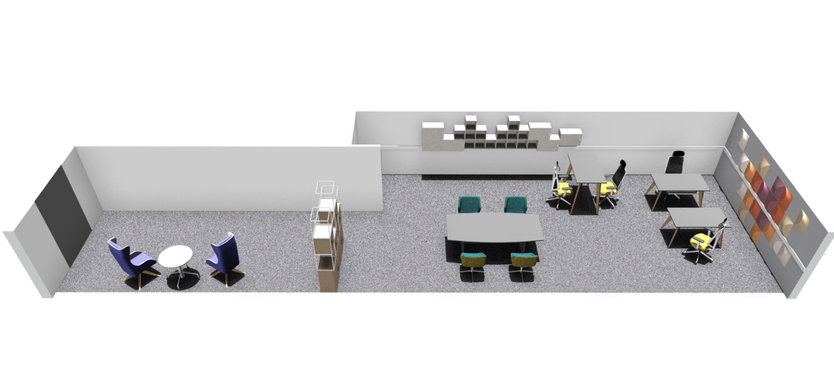 We decided that our soft seating armchair options along with a recycled hairpin leg coffee table would make a statement entering the office. The choice of a grid storage unit was our take on offering space to store things while also using them as a partition to create a wall between the waiting area and the office space behind it. For the meeting area, a boat-shaped table was chosen in Halifax Oak finish. The two different height desk regular workspaces were realised with pyramid leg desks to elevate the space and add a more ergonomic working environment. The finishes for the chairs were deliberately chosen as grey, yellow and forest green to compliment the company’s brand DNA displayed on the back wall.