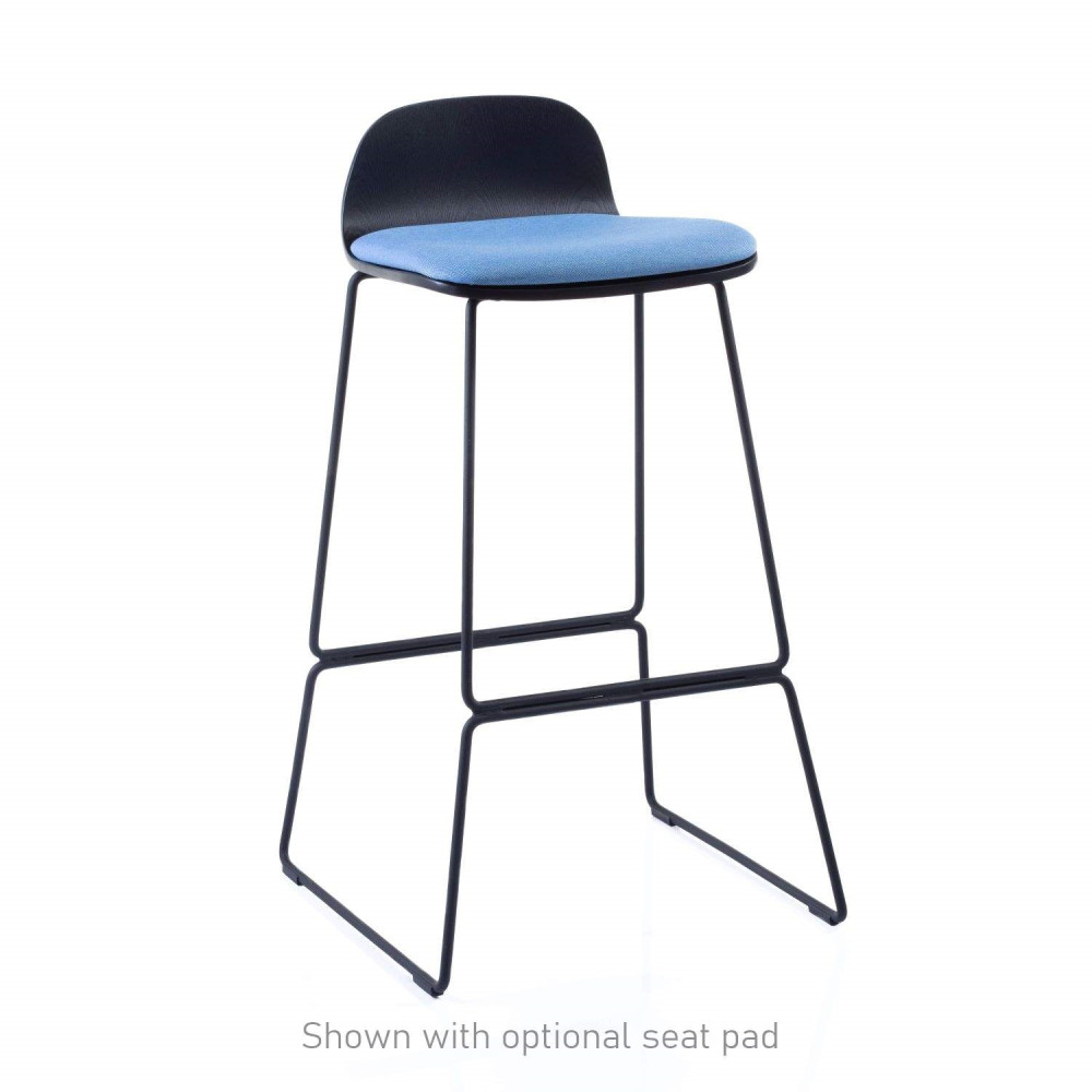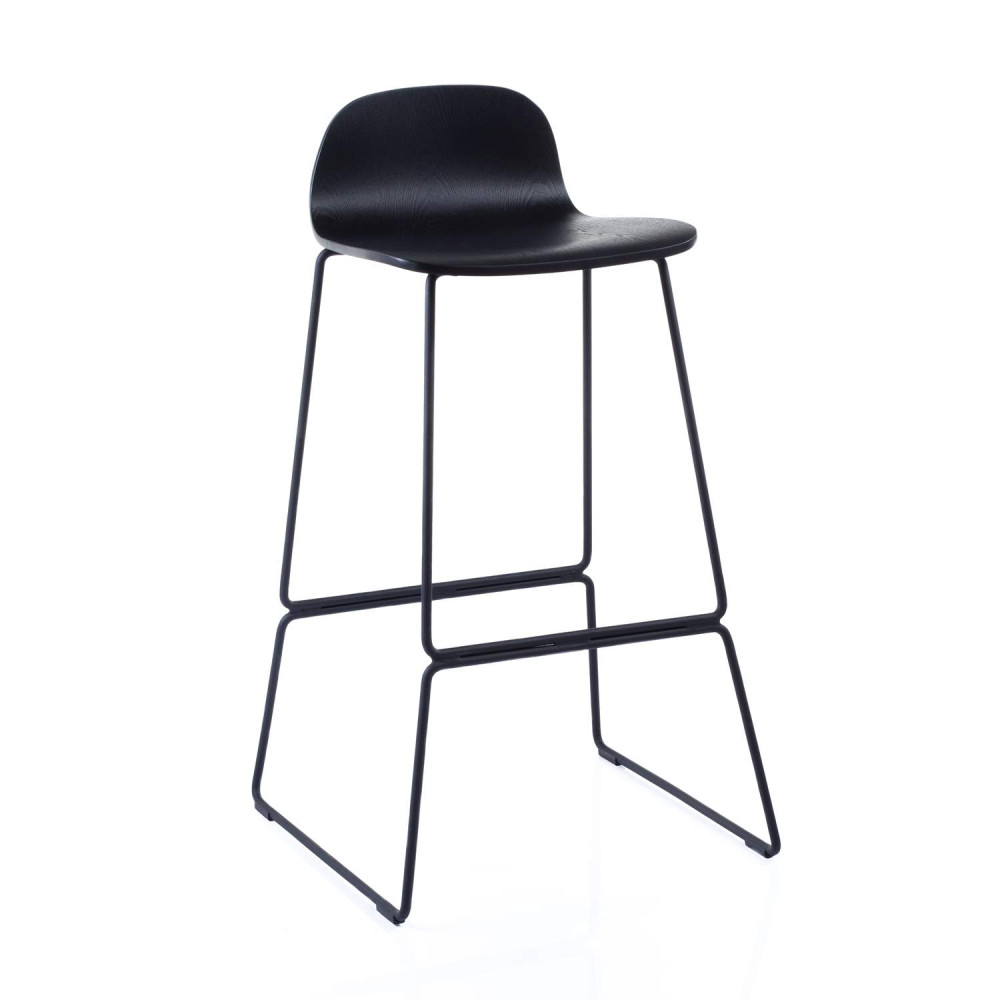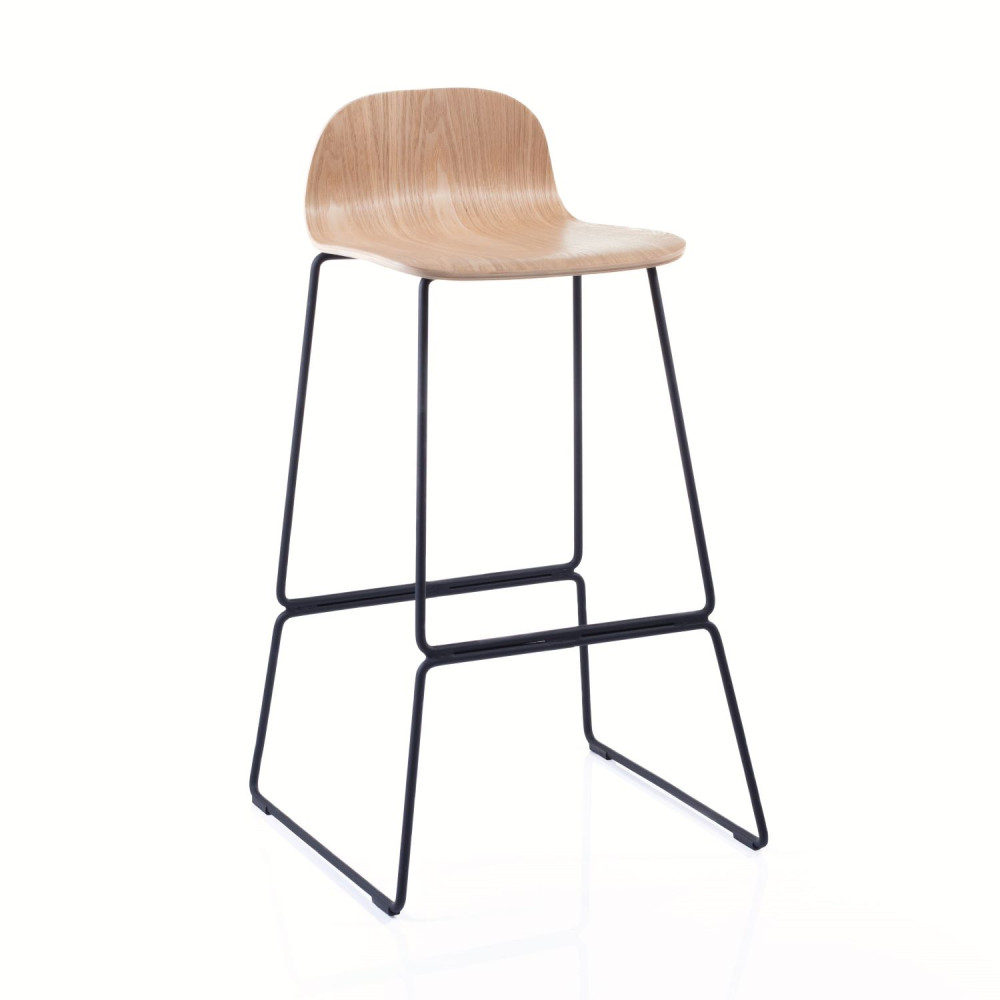 The Arundel high breakout stool in lacquered wood veneer with a black steel skid frame.