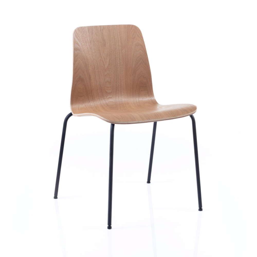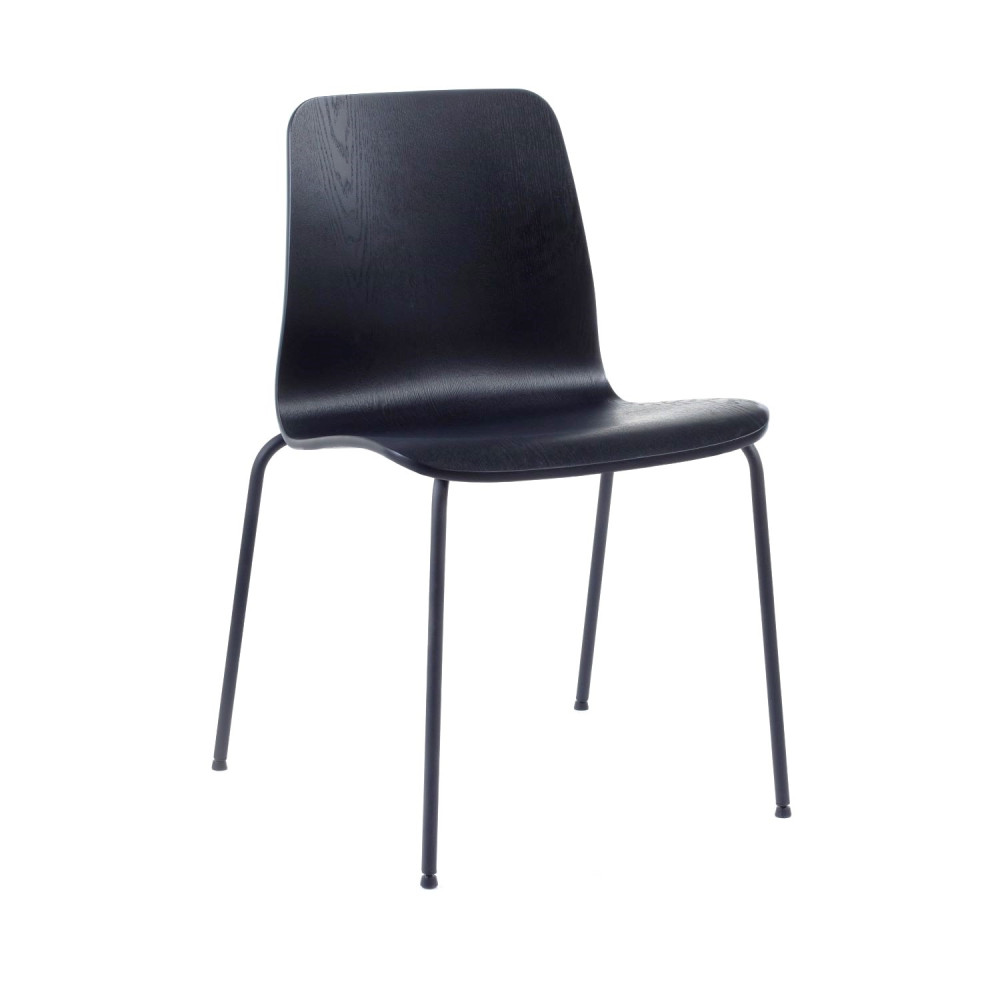 The Arundel A01 model is a lacquered wood stackable chair with a 4 legged black steel frame.