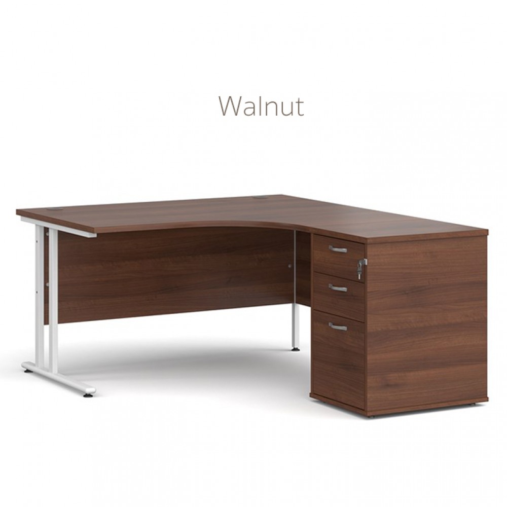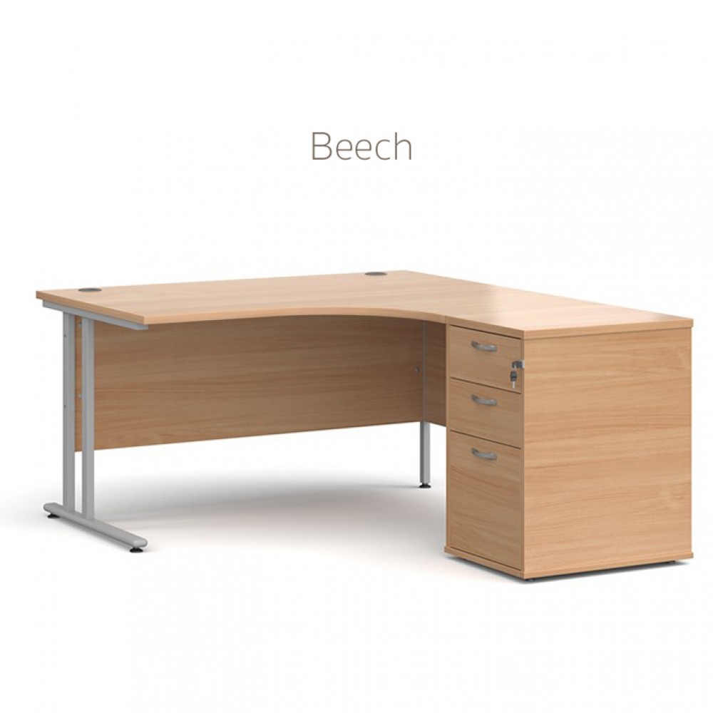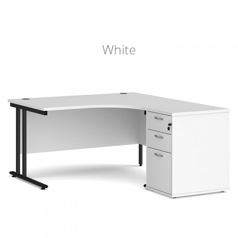 Cantilever framed corner desk with desk high pedestal included, available in small range of finishes.