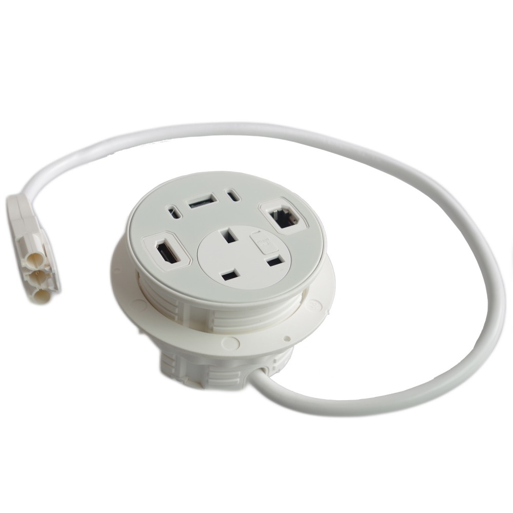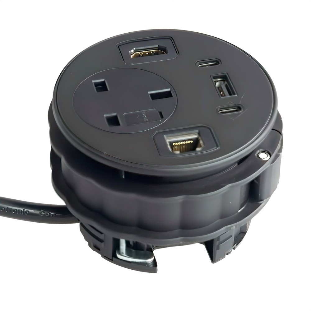 Fits inside standard Ø80mm cable port holes of office desks, tables, work-benches, and worktops.
