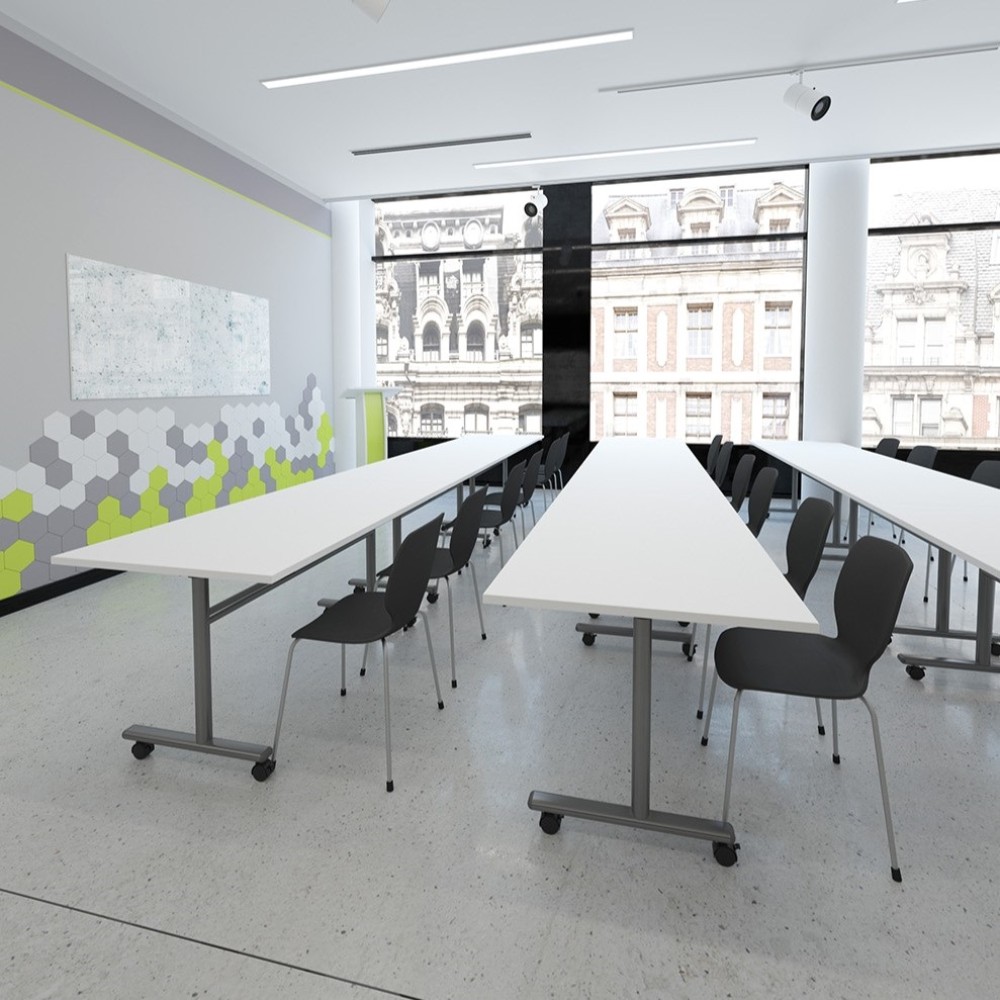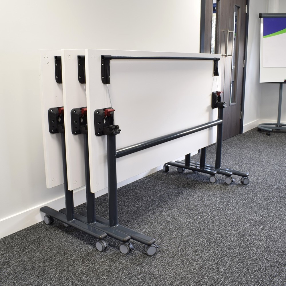 Flip top table with on castors ideal for a flexible meeting or collaboration space that can be stored away efficiently when not in use.