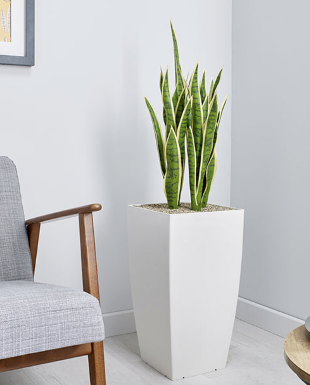 Mother-in-Law’s Tongue floor standing plant shown in Matt White planter.
