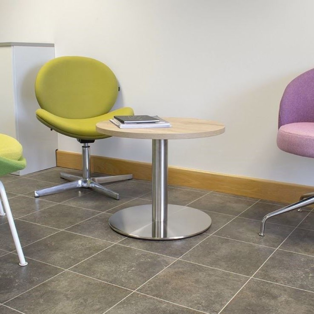 Circular 600mm dia. coffee table with brushed steel finish trumpet style leg base.
