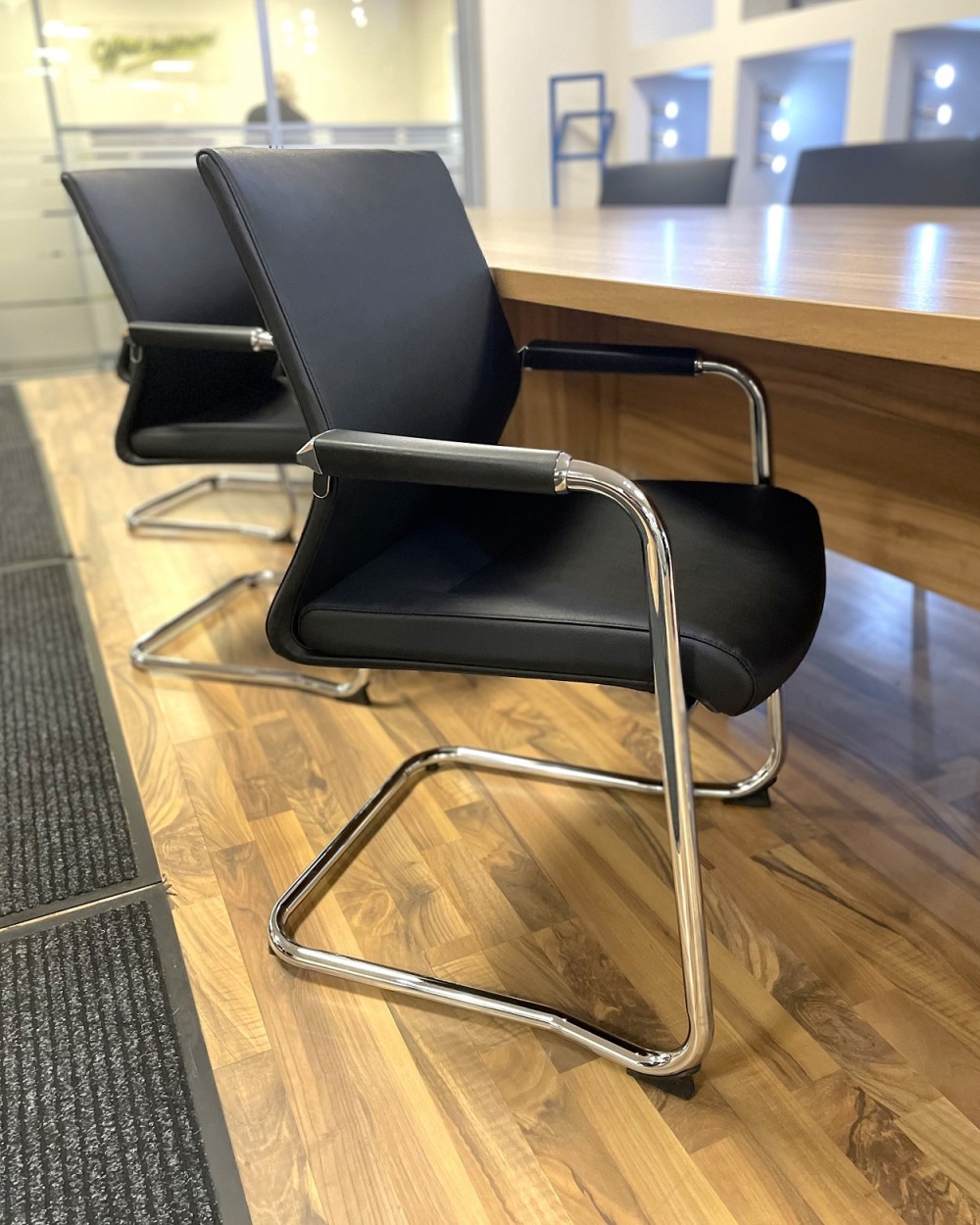 Faux leather meeting chair with sculpted seat back rest.