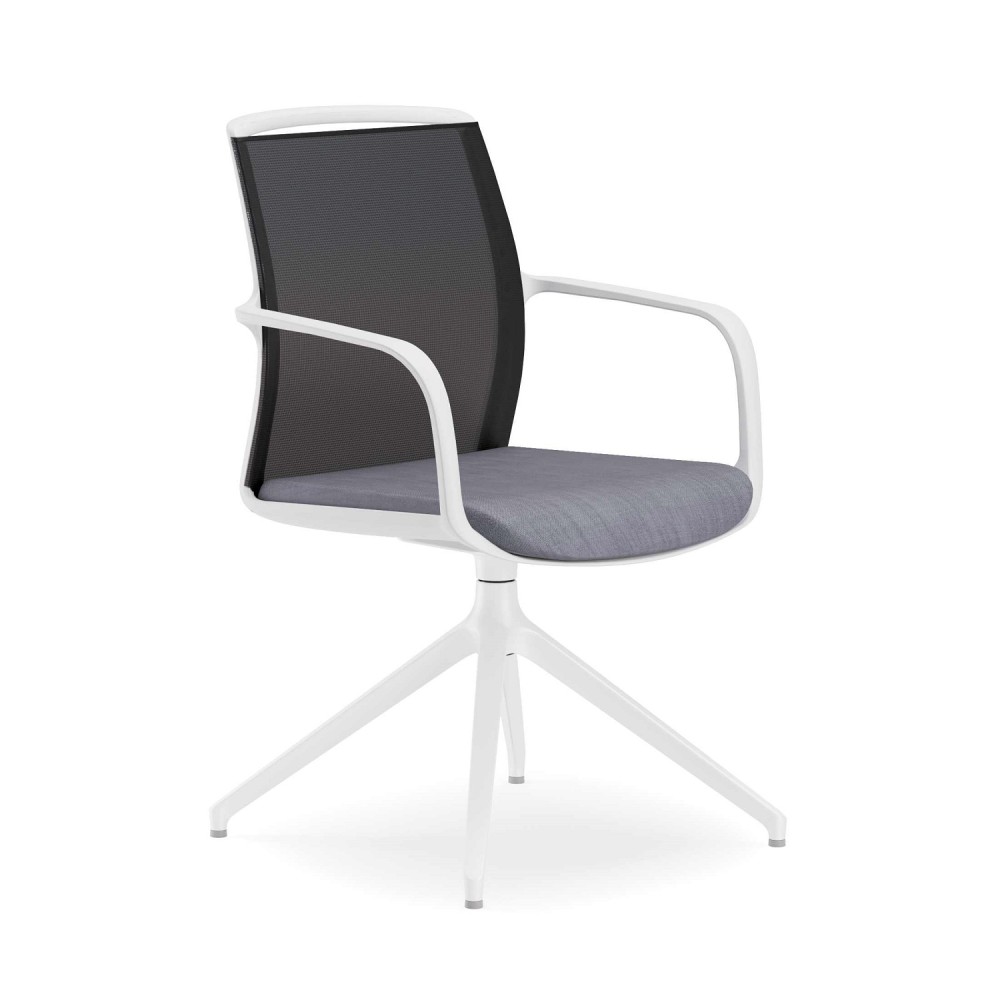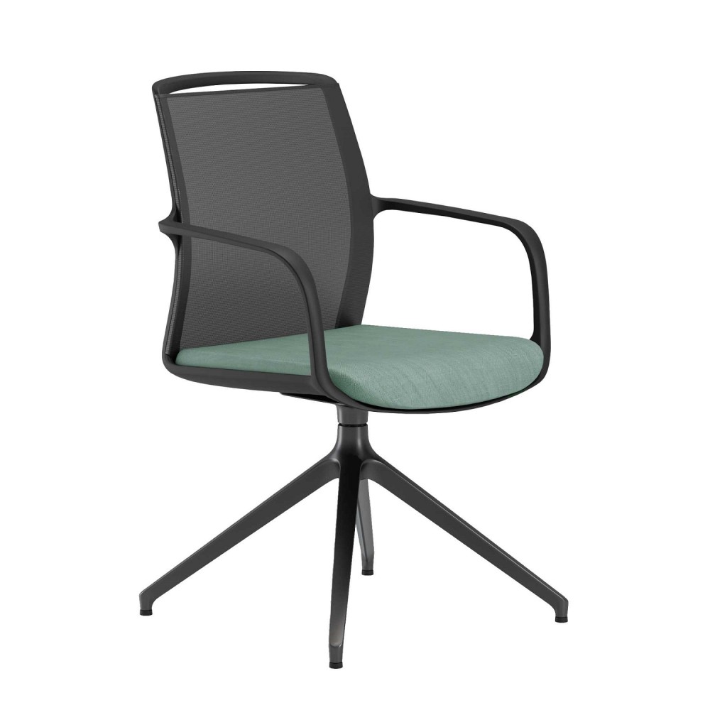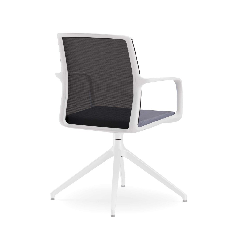 Mesh back swivel chair with pyramid style frame and upholstered seat base.