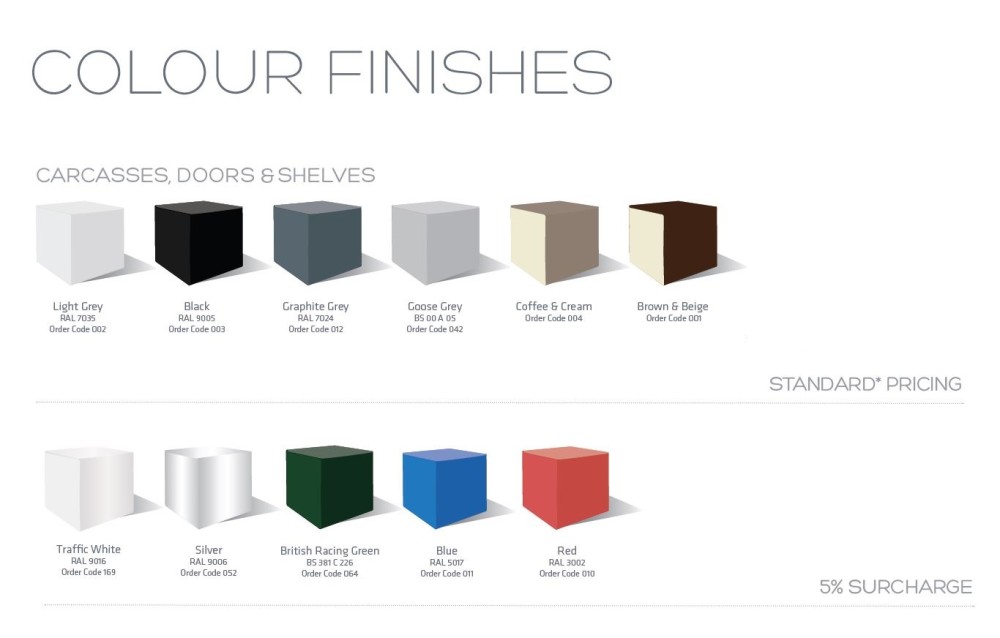 ● 6 standard Carcass Colour Finishes: see swatch image above.